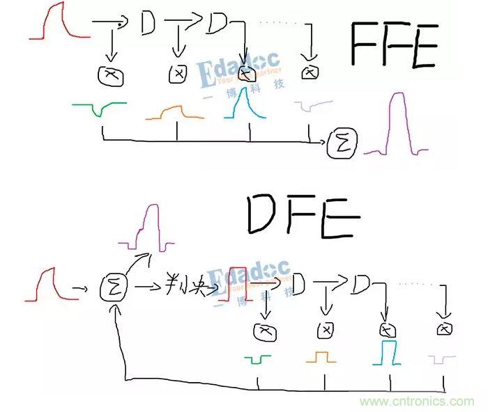 DFE (Decision Feedback Equalizer, 判決反饋均衡器)。這兩個就跟FIR比較像。只不過FIR中的乘法器是乘一個脈沖信號,而FFE與DFE中的乘法器,乘以信號本身??磮D理解:
