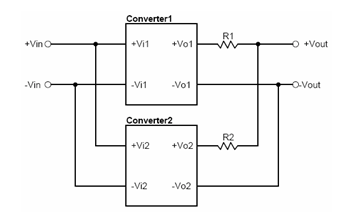 在兩組電源模塊的輸出端,分別串接Drop電阻,再并聯(lián)使用,如圖3-1所示。此種方式主要利用輸出電流對R1及R2形成的線性電壓降,使得兩組電源模塊會盡量達(dá)到平衡供應(yīng)負(fù)載的目的,避免輸出電壓較高的電源模塊來提供大部份的負(fù)載需求。