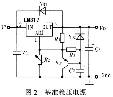 LM317是美國國家半導(dǎo)體公司的三端可調(diào)正穩(wěn)壓器集成電路,輸出電壓范圍是1.2~37 V,負(fù)載電流最大為1.5 A,使用簡單。其工作過程如下:輸出電壓Vout通過R1、VQ1,對C2充電,開始時(shí)VQ1飽和導(dǎo)通,Vout最低(約1.5 V)。隨著C2上電壓的升高,VQ1逐漸退出飽和并趨于截止,Vout逐漸升高至額定電壓。改變R1、C2的常數(shù)可改變軟啟動的時(shí)間。改變可變電阻R2的值,可調(diào)整輸出電壓Vout的值。VD1用于關(guān)機(jī)后使C2上的電荷快速泄放。其輸出電壓為:
