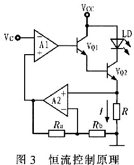 為了實(shí)現(xiàn)高的電流穩(wěn)定度,驅(qū)動電路大多采用負(fù)反饋的控制方法,恒流控制原理如圖3所示。穩(wěn)流電路由基準(zhǔn)電壓電路、電壓-電流轉(zhuǎn)換電路、恒流輸出電路和反饋電路組成。電路工作時(shí),基準(zhǔn)電壓經(jīng)過適當(dāng)放大后送入運(yùn)放A1的同相端,運(yùn)放A1控制VQ1基極電流的大小,從而獲得相應(yīng)的輸出電流,輸出電流在取樣電阻R上產(chǎn)生取樣電壓,該取樣電壓經(jīng)A2放大后作為反饋電壓反饋回電壓放大器A1的反相輸入端,并與同相輸入端的電壓進(jìn)行比較,對輸出電壓進(jìn)行調(diào)整,進(jìn)而對VQ1基極的輸出電流進(jìn)行調(diào)整,使整個閉環(huán)反饋系統(tǒng)處于動態(tài)的平衡中,以達(dá)到穩(wěn)定輸出電流的目的。
