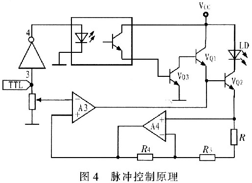 根據(jù)上述設(shè)計(jì)思想設(shè)計(jì)脈沖控制接口電路,其原理圖如圖4所示。由非門單元,晶體管VQ3,光電耦合器組成。當(dāng)脈沖為高電平時(shí),非門輸出低電壓,使光電耦合器截止,光電耦合器輸出低電平,使晶體管VQ3截止,VQ3集電極輸出高電平使VQ1、VQ2導(dǎo)通,LD正常工作;反之,光電耦合器導(dǎo)通,使VQ3導(dǎo)通,VQ3集電極輸出低電平,使VQl、VQ2截止,LD不工作。在沒有外控脈沖控制信號時(shí),接口懸空,非門輸入高電平,輸出低電壓,光電耦合器不工作,晶體管VQ3截止,VQ3集電極為高電平,使VQ1導(dǎo)通,保證LD的正常連續(xù)發(fā)光。