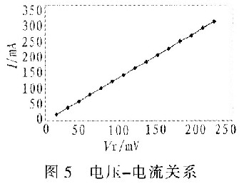 表1是該電路驅(qū)動波長650 nm,功率200 mW的LD連續(xù)工作時(shí),基準(zhǔn)電壓與輸出電流的測試結(jié)果,其電壓-電流關(guān)系如圖5所示。
