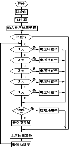 系統(tǒng)接通市電,合上電源開關(guān)后,單片機進行初始化,延時2秒后,進行輸入電壓檢測,若輸入電壓在允許范圍內(nèi),則根據(jù)電壓值進行相應(yīng)的電壓補償,否則補償電路不進行任何動作,但要相應(yīng)的聲光告警;電壓調(diào)整完畢達到輸出標準后,自動合上輸出交流接觸器,系統(tǒng)正常輸出。此時,單片機對輸出電壓進行過壓檢測,一旦輸出電壓過高,則切斷輸出,以防輸出電壓過高而影響負載工作,在電壓恢復正常后,自動合閘,輸出電壓。單片機還對輸入電壓進行實時檢測,只要市電發(fā)生變化,就進入相應(yīng)的電壓補償子程序,對補償電壓進行調(diào)整。其流程圖見圖5。