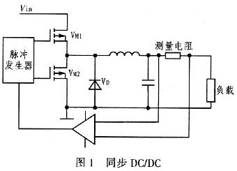 Vin為輸入電壓,VM1、VM2為MOSFET,VM1導通寬度決定輸出電壓大小,快恢復二極管和VM2共同續(xù)流電路,整流管的導通損耗占據(jù)最主要的部分,因此它的選擇至關重要,試驗中選用通態(tài)電阻很低的M0SFET。電感、電容組成濾波電路。測量電阻兩端電壓與給定值比較后,通過脈沖發(fā)生器產(chǎn)生相應的脈寬,保持負載電流穩(wěn)定。VM1關斷,快恢復二極管工作,快恢復二極管通態(tài)損耗大,VM2接著開通續(xù)流,減少系統(tǒng)損耗。