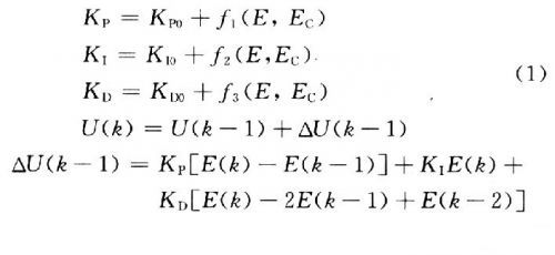 根據(jù)前面敘述,用DSl8B20讀取溫度采樣值,再通過參數(shù)自整定的Fuzzy-PID算法對數(shù)據(jù)進行處理:根據(jù)E和Ec的狀況,由模糊控制規(guī)律再通過模糊表推導(dǎo)出△KP,KI,KD,根據(jù)式(1)計算出KP,KI,KD的大小,再計算出U的初值和△U,由式(2)實時計算控制量U。通過參數(shù)轉(zhuǎn)換,將U轉(zhuǎn)換為PWM參數(shù),修改EvaRegs.CMPRl的數(shù)值,改變PWM的占空比,從而控制TEC的制冷/制熱功率。