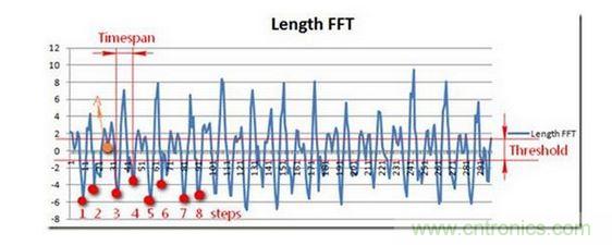 人體最快的跑步頻率為5HZ,也就是說相鄰兩步的時間間隔的至少大于0.2秒,如圖所示,我們設(shè)置了timespan在記步過程中我們過濾了高頻噪聲,即步頻過快的情況。同時我們通過和上次加速度大小進(jìn)行比較,設(shè)置設(shè)立一定的閥值Threshold來判斷運動是否屬于有效,有效運動才可進(jìn)行記步。